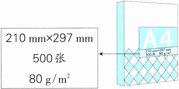 1. (名校期末真题)如图所示,这是一包厚$50\ mm$的A4复印纸的包装上的信息。根据图中信息,解决以下问题:(提示:计算时可把$297\ mm$看成$300\ mm$)