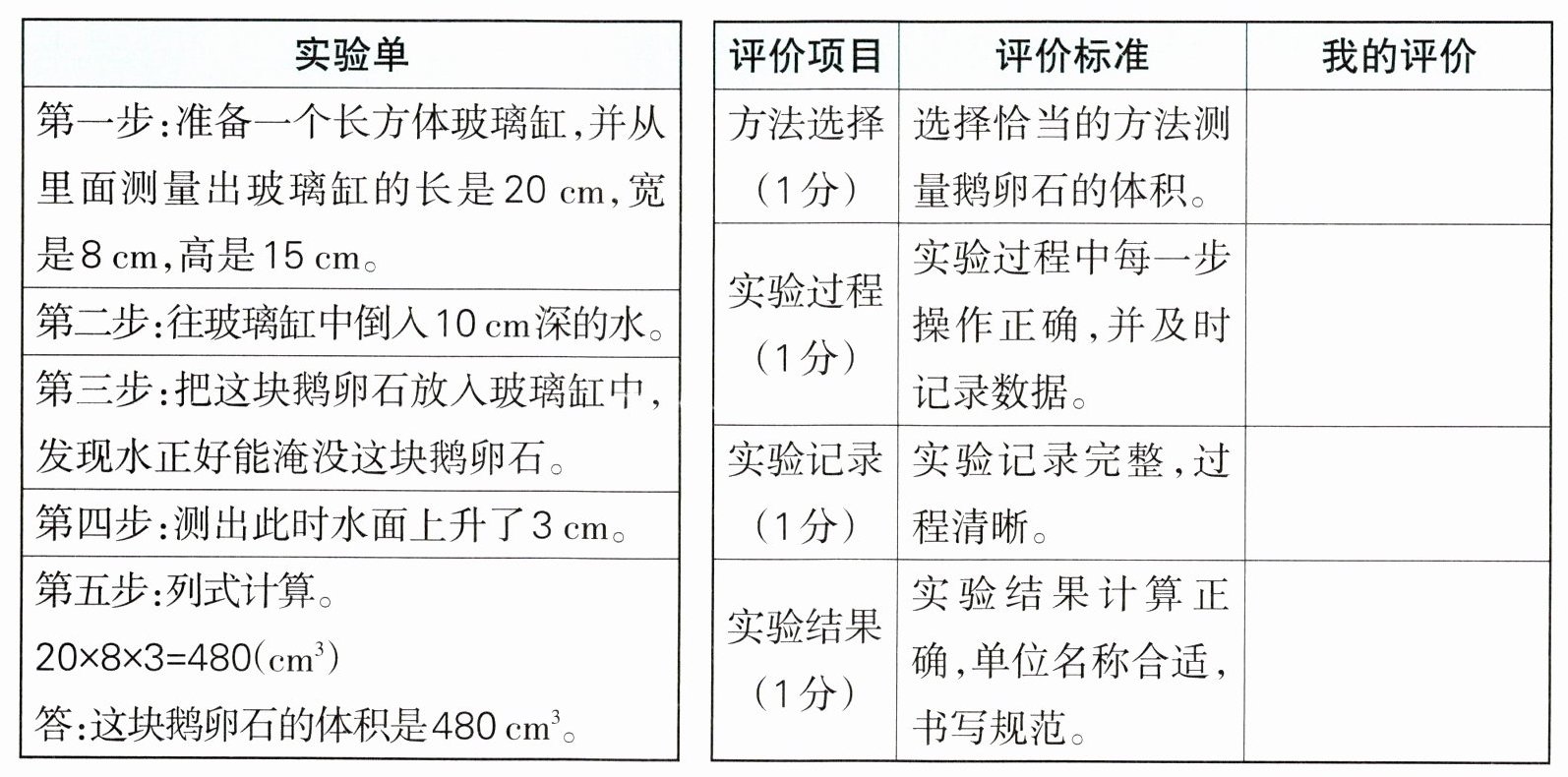 3. [新趋势·思维探究]聪聪在河边玩耍时,捡到一块鹅卵石。他想到上课老师讲了求不规则物体的体积。于是他想用排水法求这块鹅卵石的体积大约是多少,他设计了一个实验。请你阅读实验单,然后按照下表中的评价标准为聪聪的表现打分,并填入表中。