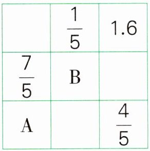 解析:由于每个横行、竖行、斜行三个数的和都相等,所以我们借助第1横行、第1竖行和从左上到右下的斜行来求解。第1横行、第1竖行和斜行的和相等,且有一个共同的加数,因此,$\frac{1}{5}+1.6=B+\frac{4}{5}=\frac{7}{5}+A$,所以$A=\frac{1}{5}+1.6 - \frac{7}{5}=\frac{2}{5}$,$B=\frac{1}{5}+1.6 - \frac{4}{5}=1$。A处应填$\frac{2}{5}$,B处应填1。