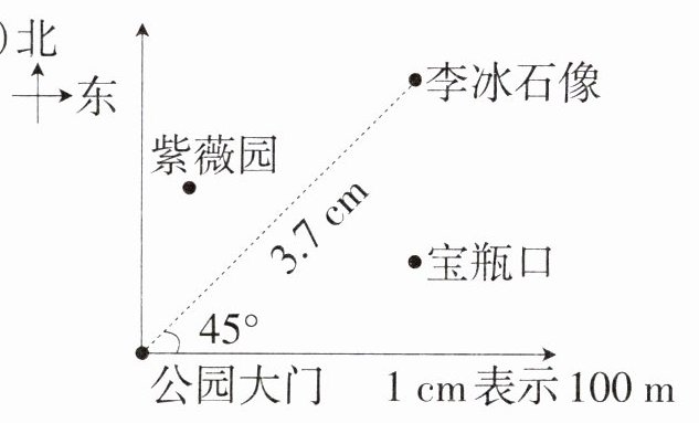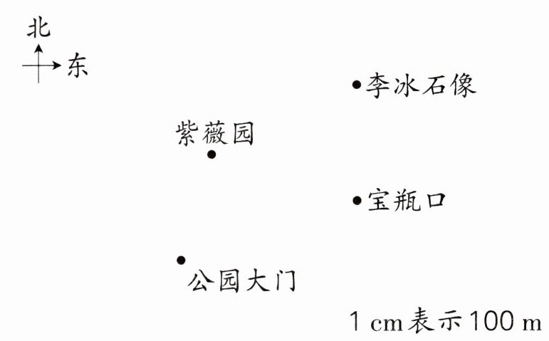 3. (名校期末真题)笑笑一家周末去都江堰离堆公园游玩,来到公园门口,看到景区主要景点如图所示。以公园大门为观测点,你能表示李冰石像在什么位置吗?