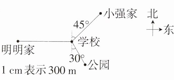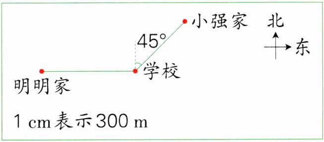 (1)判断位置时要找准观测点。从小强家到学校是以小强家为观测点,方向是南偏西45°(或西偏南45°),距离是1.5 cm也就是450 m,平均每分走450÷9 = 50(m),明明家到学校是2 cm,也就是600 m,用同样的速度走是600÷50 = 12(分)。