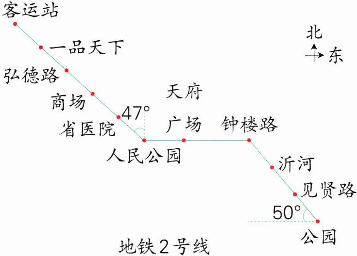 6月15日17时,爷爷和他的老战友们兴致勃勃地从公园出来,乘坐地铁2号线列车去一品天下聚餐。列车先向( )偏( )( )°方向行驶了( )站,再向西行驶了2站,最后向( )偏( )( )°方向行驶了( )站到达了目的地。