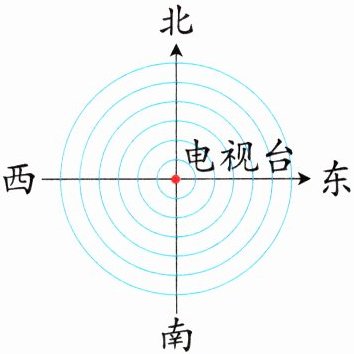 四、在广播电视台信号覆盖示意图上,相邻两圆到中心点的距离相差5 km,以电视台为中心,请在屏幕上标出下面各点的位置。