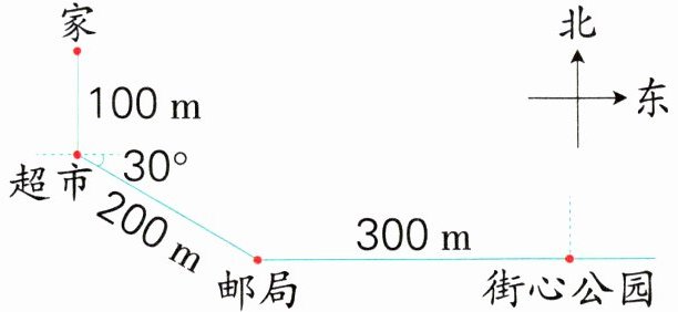 1. 笑笑从家出发,先向( )走100 m到超市,再向( )偏( )( )方向走200 m到邮局,最后向东走300 m到街心公园。