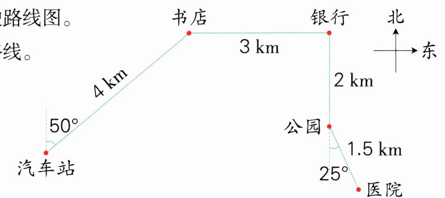 1.出租车从汽车站出发,先向北偏东 50°(或东偏北 40°)方向行驶 4 km 到达书店,然后向东行驶 3 km 到达银行,再向南行驶 2 km 到达公园,最后向南偏东 25°(或东偏南 65°)方向行驶 1.5 km 到达医院。2. 4+3=7(km) 8+(7 - 3)×1.5=14(元)答:要付 14 元。