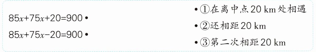 (1)$85x + 75x + 20 = 900$连②,$85x + 75x - 20 = 900$连③。