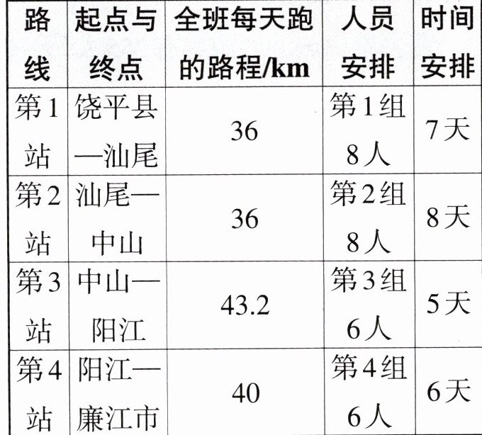 1.(1)$252 + 288 + 216 + 240 = 996(\text{km})$ 答:从饶平县到廉江市一共要跑$996\text{ km}$。 (2)$996\div8 = 124.5(\text{km})$ 答:平均每个小组需要跑$124.5\text{ km}$。 (3)$124.5\div10 = 12.45(\text{km})$ 答:平均每人跑$12.45\text{ km}$。 (4)(答案不唯一,自己根据实际情况填空即可)