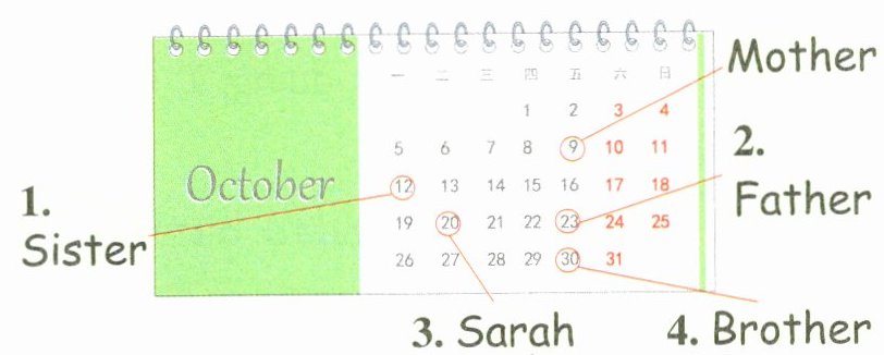 When is your sister’s birthday?@@It’s on October 12th.@@When is your father’s birthday?@@It’s on October 23rd.@@When is your birthday?@@It’s on October 20th.@@When is your brother’s birthday?@@It’s on October 30th.
