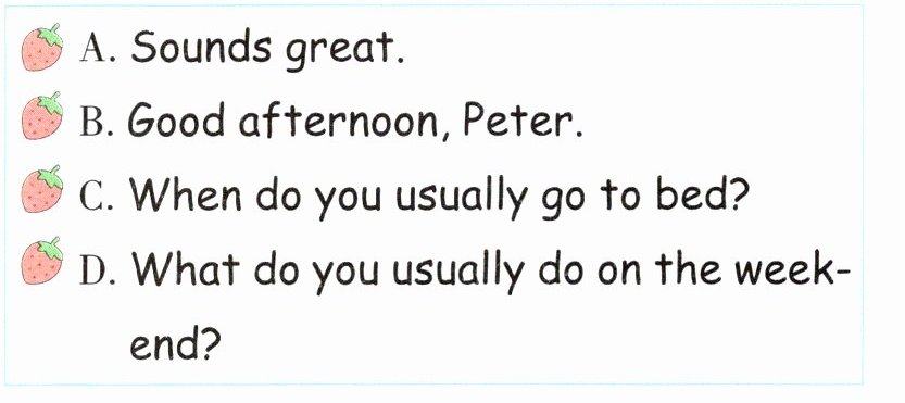 4. (名校期末真题)Sarah: What do you usually do on the weekend, Mike?(看图写答语)