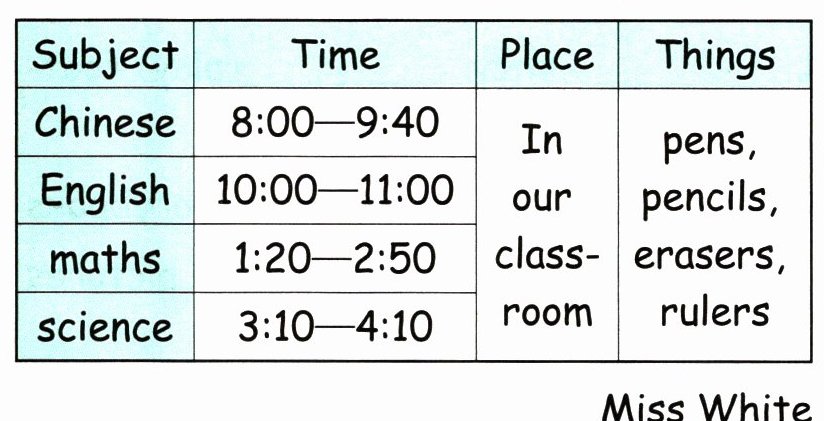 ( )4. ______ Tuesday, Mary ______ Chinese, science and music.