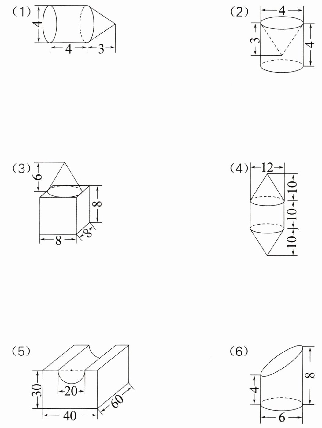 3.14×6²×10 + 1/3×3.14×6²×10×2 = 1884(cm³)@@40×60×30 - 3.14×(20÷2)²×60÷2 = 62580(cm³)@@3.14×(6÷2)²×(4 + 8)÷2 = 169.56(cm³)