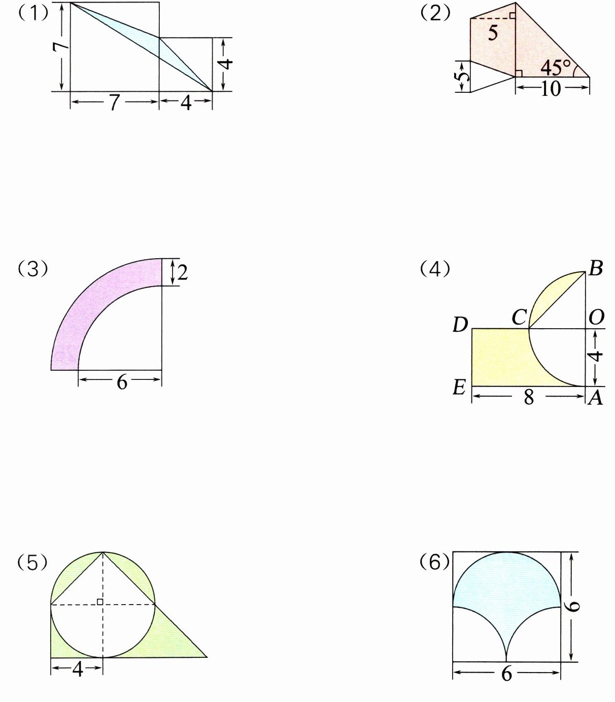 65 - 57 = 8(cm²)@@(10 - 5 + 10)×5÷2 + 10×10÷2 = 87.5(cm²)@@3.14×(6 + 2)²×1/4 - 3.14×6²×1/4 = 21.98(cm²)@@(8 - 4 + 8)×4÷2 = 24(cm²)@@4×2 = 8(cm)
