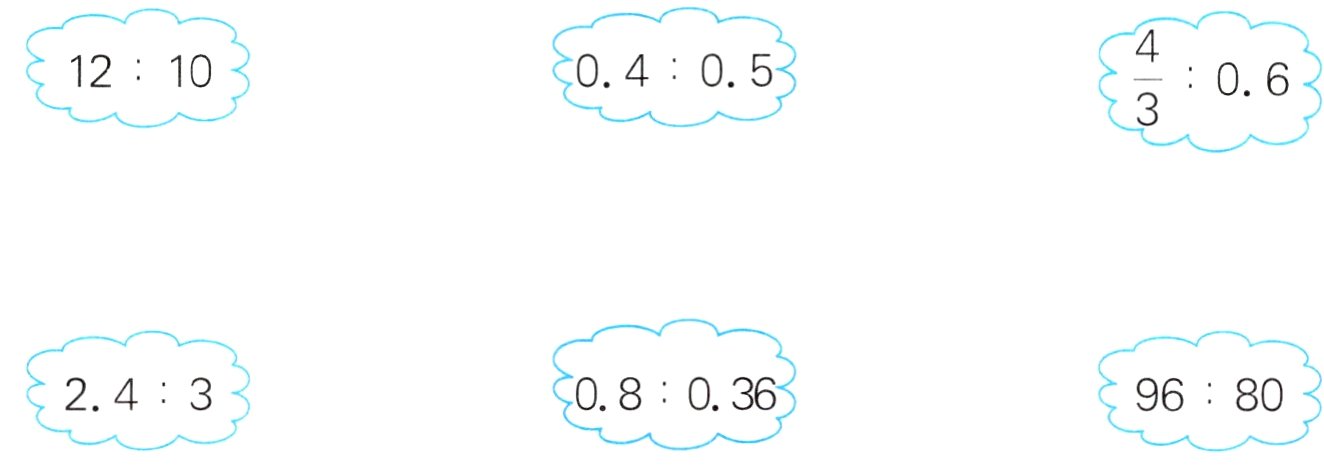 0.36 : 0.6 = $\frac{3}{5} : 0.24 =$ 3.25 : $\frac{13}{4}$ = 18秒 : 1.2分 =