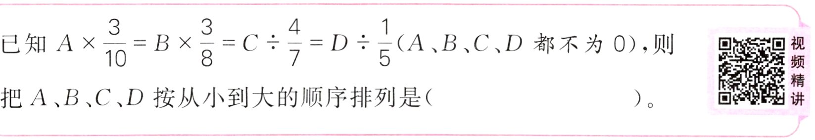 D < C < B < A 解析:假设A × $\frac{3}{10}$ = B × $\frac{3}{8}$ = C ÷ $\frac{4}{7}$ = D ÷ $\frac{1}{5}$ = 1,则A = $\frac{10}{3}$,B = $\frac{8}{3}$,C = $\frac{4}{7}$,D = $\frac{1}{5}$,因为$\frac{1}{5}$ < $\frac{4}{7}$ < $\frac{8}{3}$ < $\frac{10}{3}$,所以D < C < B < A。