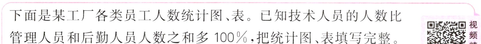 下面是某工厂各类员工人数统计图、表。已知技术人员的人数比管理人员和后勤人员人数之和多100%,把统计图、表填写完整。