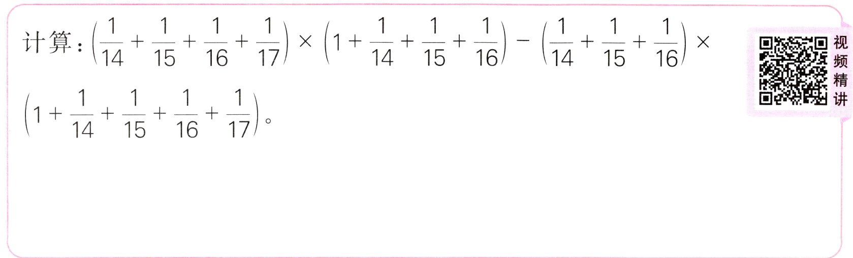 解析:将重复出现的部分看成整体,用字母代替,设$\frac{1}{14} + \frac{1}{15} + \frac{1}{16} = a$,$\frac{1}{14} + \frac{1}{15} + \frac{1}{16} + \frac{1}{17} = b$,利用换元法把算式变成用字母表示的形式,化繁为简。
