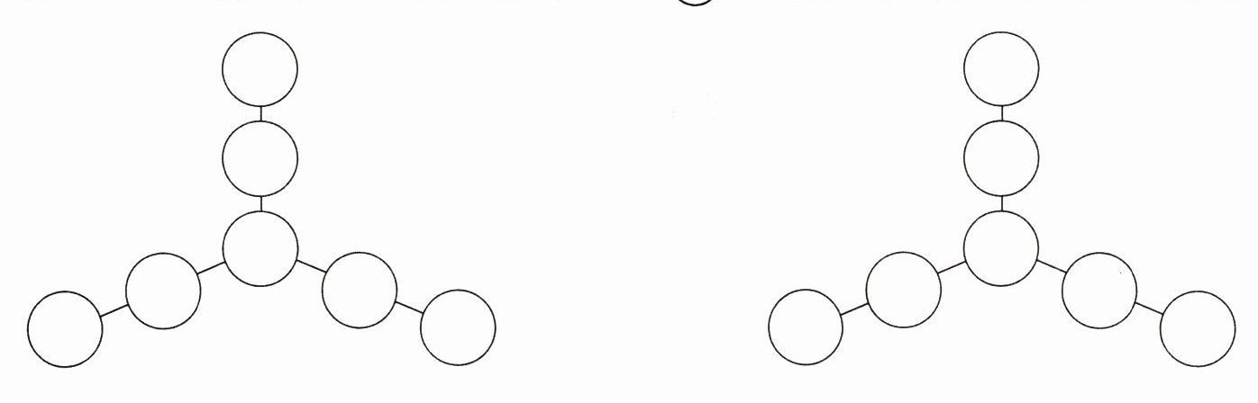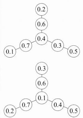 把0.1~0.7填入下图中,使每条线上三个$\bigcirc$内数的和相等。(写出2种情况)