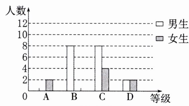 3. 某校对九年级学生进行了一次文科综合中考模拟测试,成绩x(单位:分,x为整数)被评定为优秀、良好、合格、不合格四个等级(优秀、良好、合格、不合格分别用A、B、C、D表示,A等级:90≤x≤100,B等级:80≤x<90,C等级:60≤x<80,D等级:0≤x<60). 该校随机抽取了一部分九年级学生的成绩进行调查,并绘制成了如下统计表及如图所示的不完整的统计图: