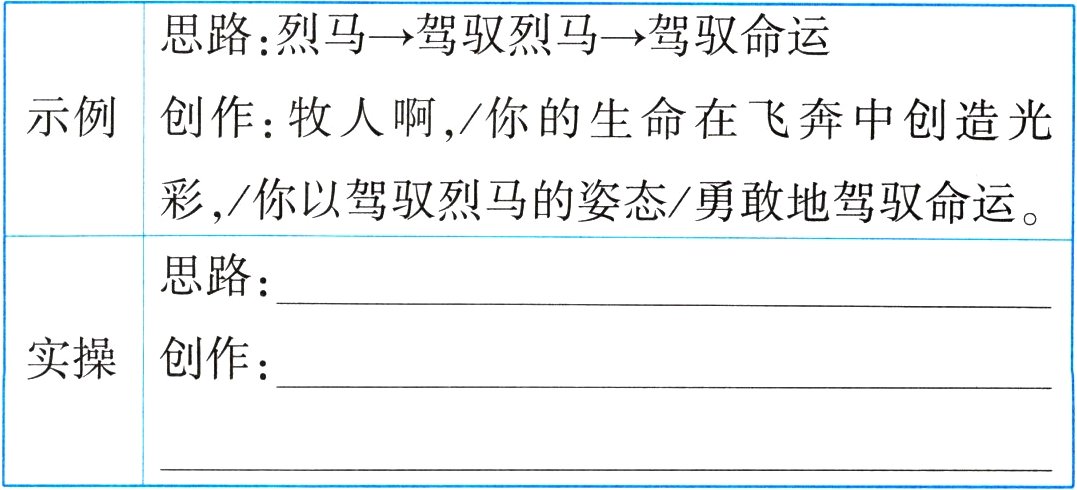 示例:烈马→驾驭烈马→驾驭使命 将军啊,/你的身躯在飞奔中守卫山河,/你以驾驭烈马的英姿/坚定地驾驭使命。