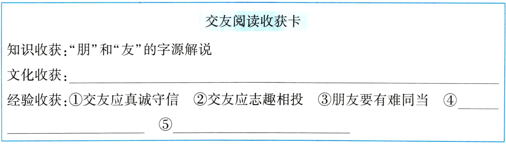 经验收获:①交友应真诚守信 ②交友应志趣相投 ③朋友要有难同当 ④____________________ ⑤____________________