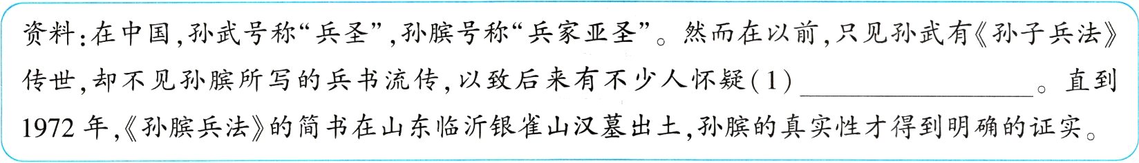 资料:在中国,孙武号称“兵圣”,孙膑号称“兵家亚圣”。然而在以前,只见孙武有《孙子兵法》传世,却不见孙膑所写的兵书流传,以致后来有不少人怀疑(1)____________________。直到1972年,《孙膑兵法》的简书在山东临沂银雀山汉墓出土,孙膑的真实性才得到明确的证实。
