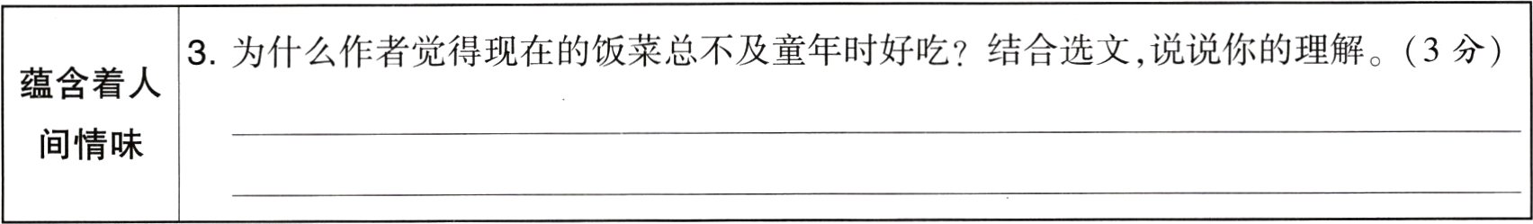 |蕴含着人间情味|3. 为什么作者觉得现在的饭菜总不及童年时好吃?结合选文,说说你的理解。(3分)|_______|