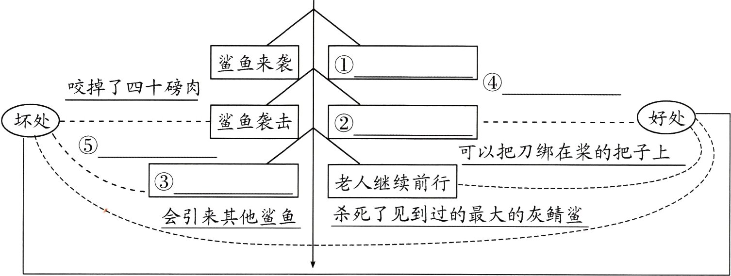2. 根据选文内容,先梳理主要情节,补全空格①②③。然后根据《鲁滨逊漂流记》中鲁滨逊记录分析自身遭遇“坏处”与“好处”的思考方法,想想老人是如何思考的,补全空格④⑤。(5分)