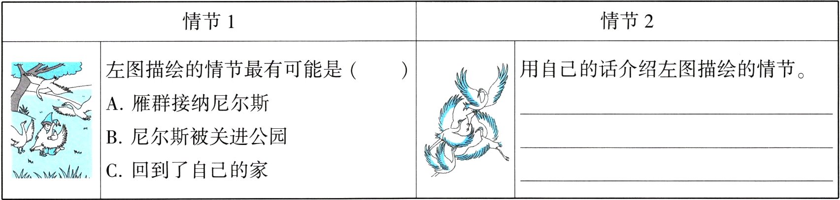 情节1:A 解析:本题考查图片与文章内容理解。观察图片可以看到戴着三角帽子的小孩怀里拥抱着大雁,其他的大雁围绕在旁边,呈现着和谐相处的画面。结合文段中“起初,雁群并不欢迎尼尔斯,但尼尔斯从狐狸口中救下一只大雁,自己却被困住了,领头雁阿卡大受感动,又去救他,他们成了好朋友”可推测该图片描绘的情节是雁群接纳尼尔斯,故选A。