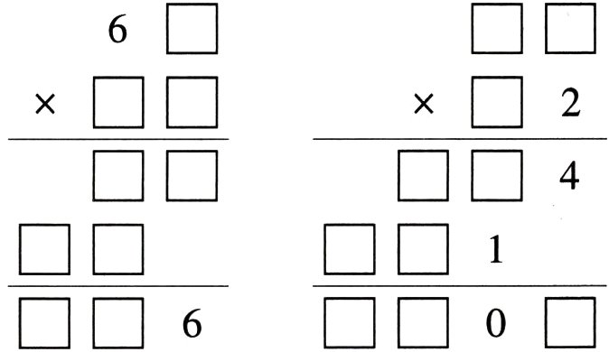提示:第一个竖式:根据两次相乘的积都是两位数,可知第二个乘数是11,根据最终得数的个位上是6,可知第一个乘数个位上是6。第二个竖式:根据第一步相乘的积是□4,第二步相乘的积是□1,可知第一个乘数的个位上是7。进而可确定第一次相乘的积是194,第一个乘数是97,第二个乘数的十位上是3。