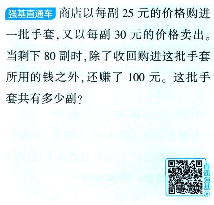 强基直通车 商店以每副25元的价格购进一批手套,又以每副30元的价格卖出。当剩下80副时,除了收回购进这批手套所用的钱之外,还赚了100元。这批手套共有多少副?