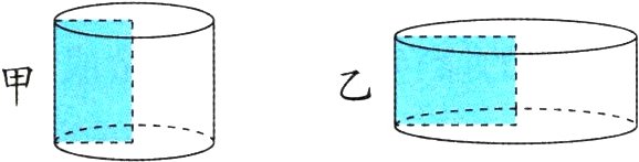 6. 一张长方形纸,若以它的长或宽为轴旋转一周,则分别形成圆柱甲和圆柱乙,如图。下面大小关系正确的是( )。