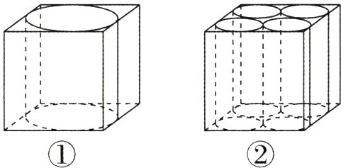 5. 如图,将棱长相等的两块正方体木料①、②分别加工成1个和4个圆柱,剩下的木料体积相比,结果是( )。