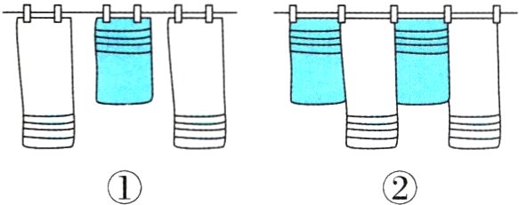 4. (假设思想)王阿姨要挂32条毛巾,先将每条毛巾用两个夹子挂起,如图①。当她发现夹子个数不够时,开始用如图②的方式挂毛巾。王阿姨挂了32条毛巾,共用了45个夹子,她按图①和图②的方式分别挂了多少条毛巾?