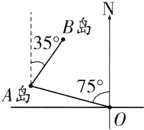 6. 如图,一艘轮船从海港点O出发,以每小时10千米的速度沿( )偏( )( )°方向行驶4小时到达A岛,然后以每小时15千米的速度沿( )偏( )( )°方向行驶2小时到达B岛。