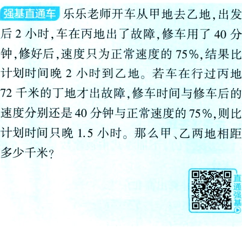 (强基直通车)乐乐老师开车从甲地去乙地,出发后2小时,车在丙地出了故障,修车用了40分钟,修好后,速度只为正常速度的75%,结果比计划时间晚2小时到乙地。若车在行过丙地72千米的丁地才出故障,修车时间与修车后的速度分别还是40分钟与正常速度的75%,则比计划时间只晚1.5小时。那么甲、乙两地相距多少千米?