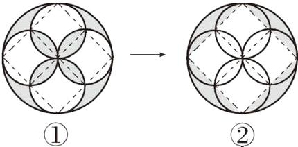 提示:如图①,在大圆内画一个最大的正方形,把正方形内的涂色部分平均分成 8 份,然后把这 8 个小涂色部分移至正方形外的空白部分(如图②)。涂色部分的面积 = 大圆的面积 - 正方形的面积 = $3.14×(10÷2)^{2}-10×10÷2 = 28.5$(平方厘米)。