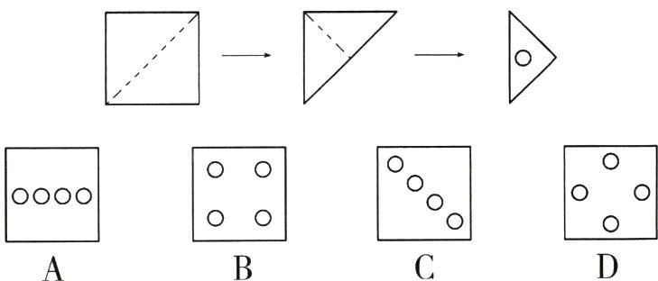 (3)如图所示,小明将一个正方形沿虚线对折两次,在中央处打孔后再将它展开,展开后的图形是( )。