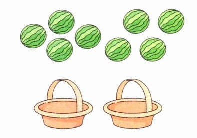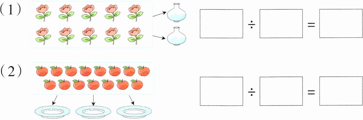 1. (1)把( )个西瓜平均放在( )个篮子里,每篮放( )个。$\square\div\square=\square$