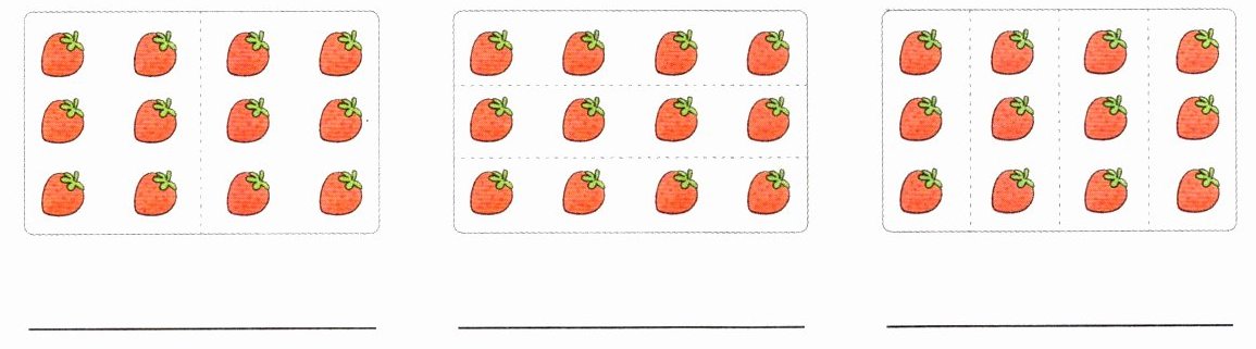 3. 把12个草莓平均分,每份有几个?用除法算式表示下面三种平均分的过程。