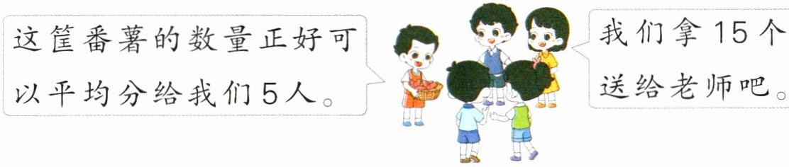 15÷5 = 3(个),要送给老师15个,可以每名同学拿出3个番薯送给老师,每名同学剩下的番薯个数还是同样多,所以剩下的番薯还可以正好平均分给5名同学。(说明方式不唯一,合理即可)