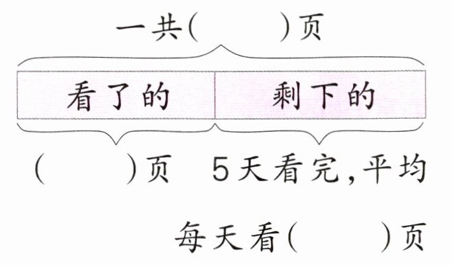 解析:一本书有85页,已经看了40页,剩下的要用5天看完,要求平均每天看多少页,可以先求出剩下多少页,用减法计算,列式是85 - 40 = 45(页)。再求平均每天看多少页,用除法计算,列式为45÷5 = 9(页)。列综合算式时把45÷5 = 9(页)中的45用85 - 40来代替,因为要先算85 - 40,所以85 - 40要加上括号,即(85 - 40)÷5 = 9(页),平均每天看9页。