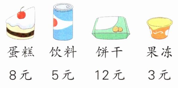(3)答案不唯一,如:买2个果冻和1包饼干一共需要多少钱? 2×3 + 12 = 18(元) 口答:一共需要18元。