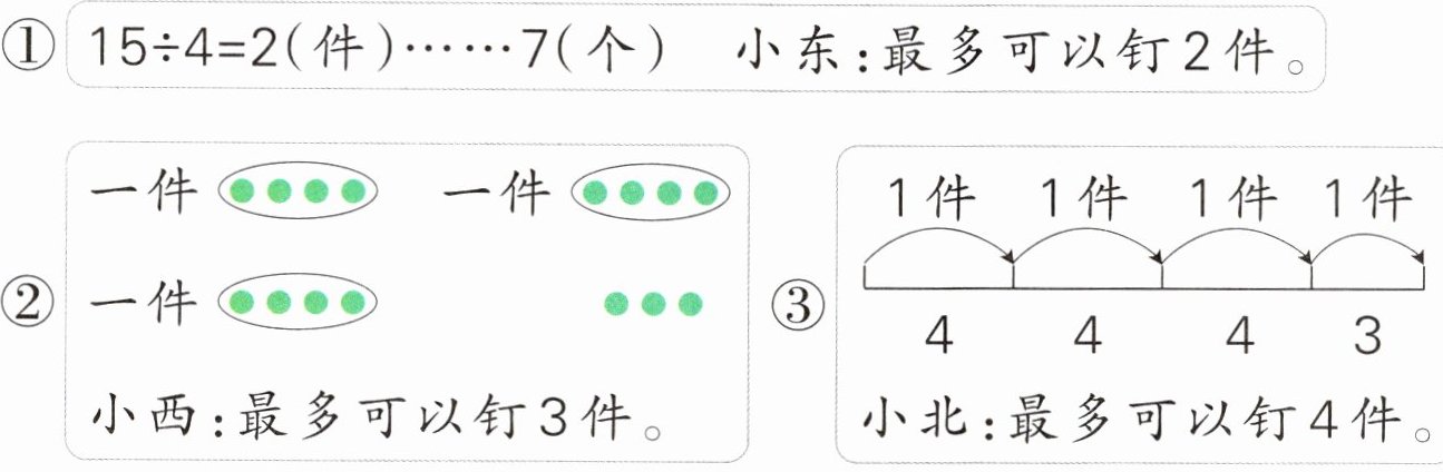1. 每件衣服要钉4个扣子,一共有15个扣子,最多可以钉几件衣服?