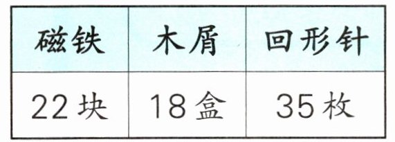 4. [新趋势·学科融合]磁铁小实验,每个小组需要4块磁铁、5盒木屑和8枚回形针。下面的材料最多可以分给几个小组?
