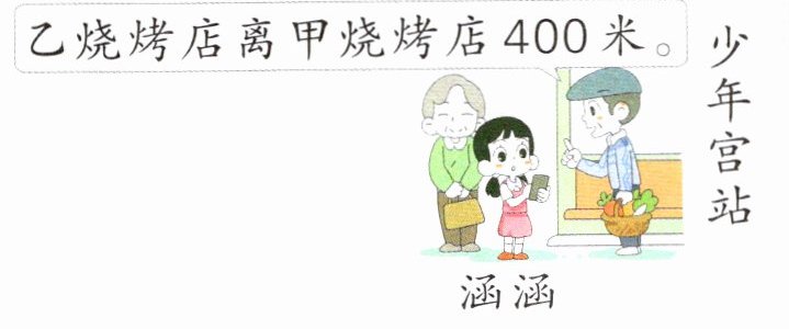 4. [新情境·生活运用]少年宫站和甲、乙两家烧烤店在同一条直直的路上,涵涵离甲烧烤店有2500米。涵涵离乙烧烤店有多远?