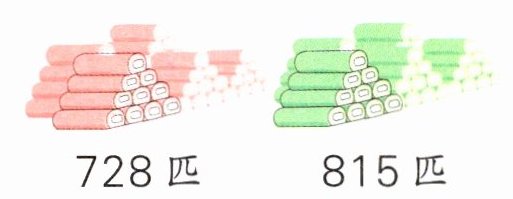 1)把728看成700,把815看成800。 700 + 800 = 1500(匹) 因为728 > 700,815 > 800, 所以728 + 815 > 1500。 口答:下面两个商队的丝绸够。 (2)700 - 300 = 400(件) 400 < 480 口答:剩下的陶瓷不够。 (3)答案不唯一,如:红茶比绿茶多收购了多少袋? 2000 - 1500 = 500(袋) 口答:红茶比绿茶多收购了500袋。