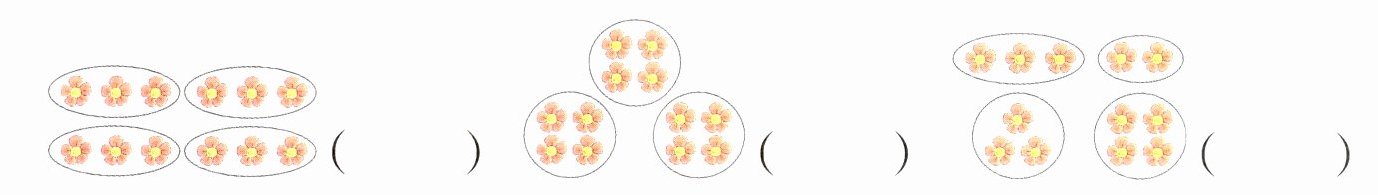 4. [教材改编]老师把12朵小红花平均分给上课积极发言的小朋友。在正确分法的( )里画“√”。