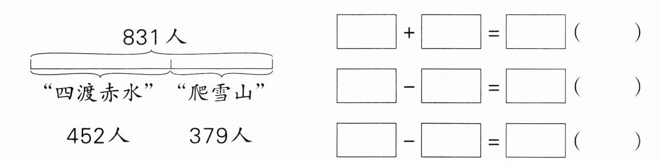 1. 同学们追寻红军足迹,体验“四渡赤水”和“爬雪山”。看图写出算式。