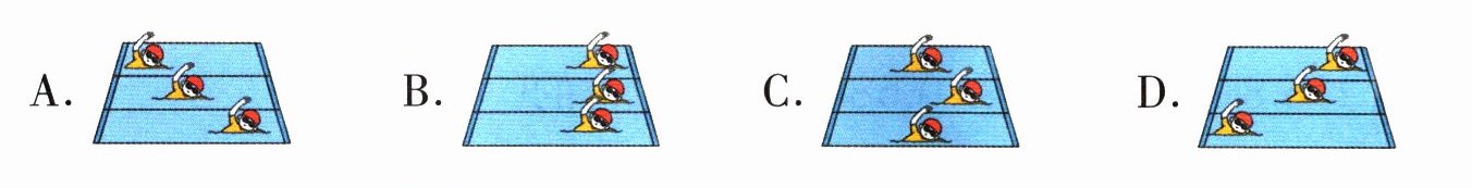 (2)[新情境·生活运用]三名同学50m游泳成绩分别为:26.15秒、26.25秒、26.90秒,下面图( )最符合当时冲刺的场景。