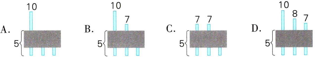 (2)下面各组小棒中,有一部分被遮住了,其中一定不能围成三角形的是( )。(单位:cm)